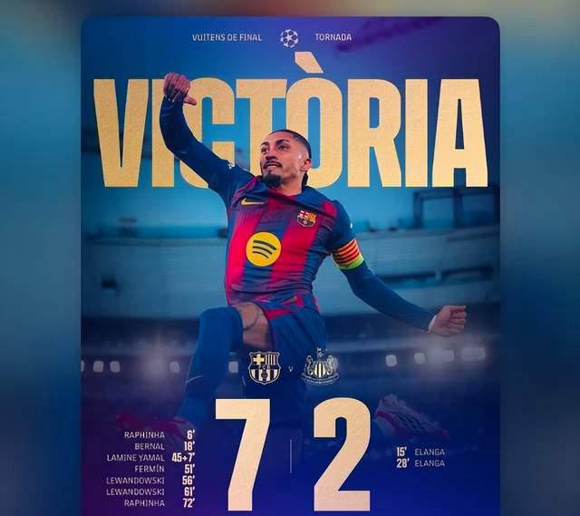 在2025-26赛季欧冠16强次回合比赛中,巴塞罗那主场以7比2大胜纽卡斯尔联队,总比分8比3强势晋级欧冠八强。拉菲尼亚表现惊艳,不仅梅开二度还制造了五个进球机会,莱万多夫斯基双响,亚马尔也贡献了一粒关键进球。这场酣畅淋漓的大胜不仅令球员和球迷沉浸在胜利喜悦中,同时也为俱乐部带来了丰厚的奖金收益。